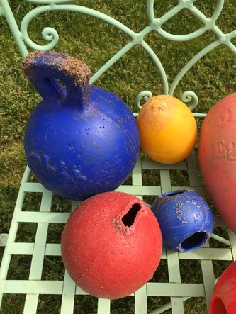 One of Jolly Pets' most popular lines of toys is the Jolly Ball made from a tough, puncture-resistant material that can withstand even the most aggressive chewers. The Jolly Ball comes in a variety of sizes, making it a great option for dogs of all breeds and sizes. Horses really enjoy many Jolly products. Many of these have lasted for years for me. My dogs keep some intact, and others will have the handle chewed. I've not had to throw any away. If a chunk comes off the handle, I make a clean cut removing the damaged area. Here are a few images of my Jolly Toys:
